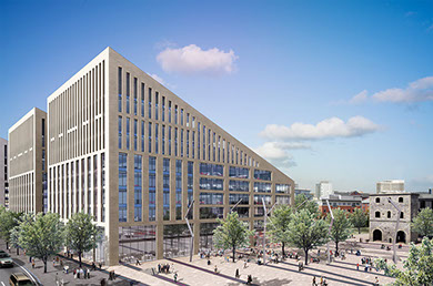 Wellington Place mixed-use masterplan development, by Feilden Clegg Bradley Studios, occupies a former old railway station site in Leeds. The low carbon development is designed around a series of public squares and pedestrian connections. The sculptural building forms are a result of defining key routes through the site, while the roofs forms maximise daylight into the streets and squares. The sculptural forms are accentuated by use of solid stone fabric with deep reveals.
